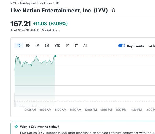 It’s been a wild day in the courtroom. Gigi Liman is there, but I’m writing it up because she’s not allowed to use electronics in the courtroom. On day one of this trial, we noted that the specter of corruption and a potential settlement is hanging over the proceedings, because Live Nation retained well-known MAGA lobbyist and fixer Mike Davis. Well today the Antitrust Division abruptly announced that it has reached a deal with Live Nation. The stock of Live Nation skyrocketed on the news.