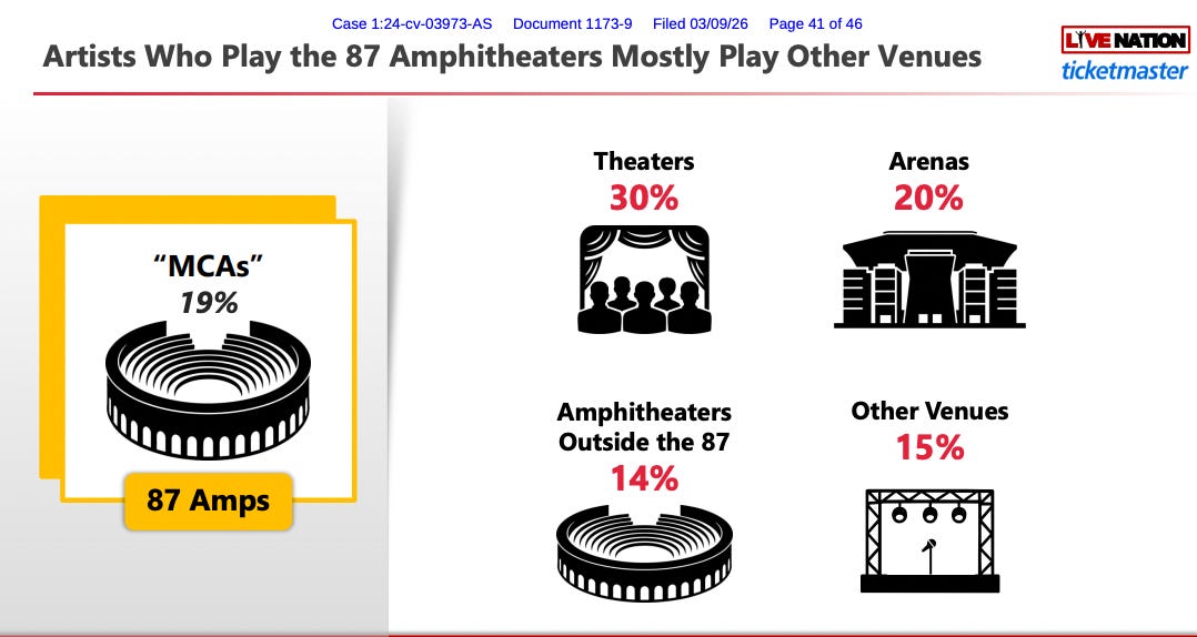 The states have presented strong evidence of Live Nation’s sheer dominance within this market and its moves to shut out competitors and drive up prices. If you’ve been paying close attention, you’ll recall the “robbing them blind” quotes. But that theory only holds if large amphitheaters constitute a distinct antitrust market.
