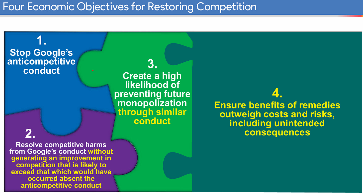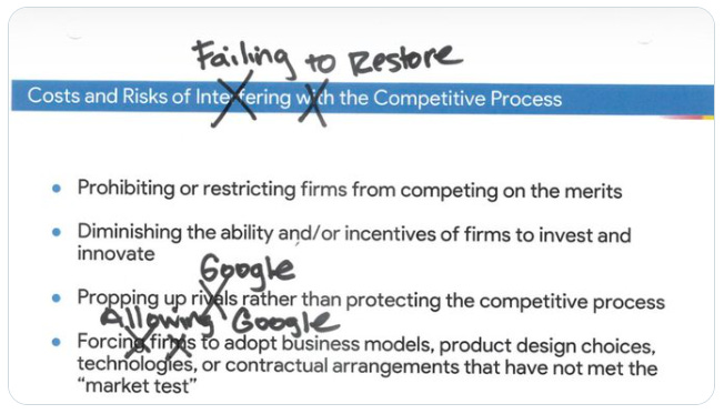 Much of Lerner’s analysis was based on a concept of the But-For World: the world that would have existed but for the illegal actions. He argued that the court’s goal in remedies should be to return the world to that state. One can imagine a justification for this idea as a hypothetical, a thought experiment to get perspective. But even lenient Judge Mehta from the Google search trial acknowledged that this is both an unrealistic exercise and contrary to legal precedent. Especially in a case where the wrongdoer destroyed or hid evidence of its wrongdoing, it doesn’t make sense to expect the victor to be able to quantify that But-For-World with certainty. Worse, Lerner said we should define the But-For World based on the trial opinion, meaning the But-For World would differ from reality only in ways that had been proven illegal in court. An action, though, has many ramifications beyond what could be proven in court! All the effects that are enabled or hidden or facilitated by wrongdoing would be considered part of the But-For World and would not be reversed or compensated. We may know the many “fruits” of illegal conduct, but only those few formally proved in court may be legitimately seized under this But-For standard. That’s Lerner’s argument here, and this shielding of Google’s ill-gotten gains seems to be its purpose.