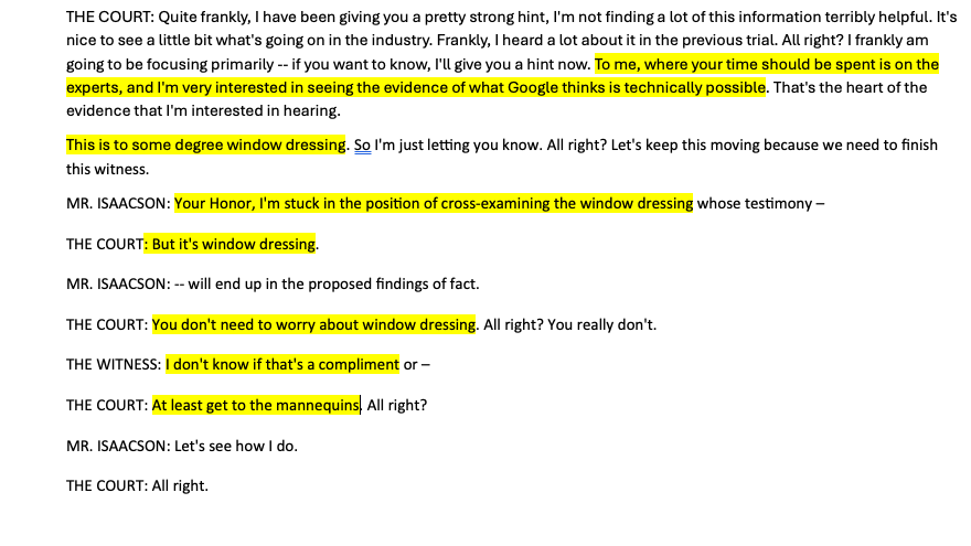 Google lawyers put each witness through a series of questions about training and experience to explicitly establish—on the record—that the witness is not an engineer qualified to give an expert opinion on the feasibility of divestiture. This pattern will probably change tomorrow, when we will start to hear from the engineers. More on that, too, later.Is Google chastened since found liable for monopolization? The DOJ lawyers ask each witness if they have noticed any change in Google’s behavior in the year since the trial or even in the five months since Judge Brinkema found Google liable. None of them ever have detected even the smallest change in Google’s overbearing behavior. (I’m always inclined to believe the witnesses, just because I’m a trusting soul, but I totally believe them on this one.) The Google lawyers ask each witness if open-web display ads are on the way to extinction, as the internet moves to walled gardens and video advertising. Everyone acknowledges they are diminishing, but all the witnesses defend the plucky open-web display ad and their faith in its vibrant future.