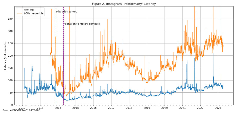 There was a kerfuffle over the admissibility of this chart into evidence, as it seems to have been prepared by a Meta expert witness we didn’t see. Chief Judge Boasberg stepped in to ask Shortway if he personally pulled and verified the data, and Shortway said he did. With that, the exhibit came into evidence. On cross, though, Shortway admitted that the first event flagged here—the migration to “VPC” (Virtual Private Cloud)—happened on Amazon Web Services (AWS), not through any use of Facebook infrastructure. It also came out on cross that Shortway pulled this latency data through April 2023, but the chart ends eight-and-a-half years before that. The FTC did one better and then showed the full data: