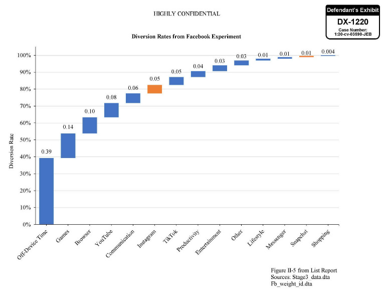 But Chief Judge Boasberg asked an obvious question: shouldn’t all the diversion ratio percentages in the exhibits add up to 100%? List said that the figures he was rattling off just measured substitution to other apps, but the above demonstrative shows that the plurality of time spent is substitution to something off-device entirely.