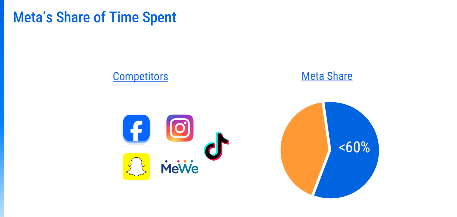 Facebook, Instagram, Snapchat, and MeWe together make up the FTC’s proposed “personal social networking services” (“PSN”) market. Without TikTok in the market, the FTC says that Meta’s market share is around 85%. With TikTok in the market, that market share falls to below 60%, as shown on the above slide—if “time spent” is an appropriate measure of market share.