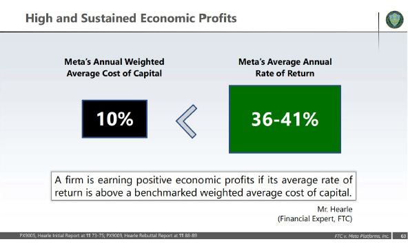 Hearle also offered a more general opinion on Meta’s economic profits, which the FTC will use as evidence of Meta’s monopoly power. Hearle compared Meta’s profits to its weighted average cost of capital. Because its average rate of return exceeds its cost of capital, the FTC’s economist Scott Hemphill will likely argue that Meta is a monopolist: