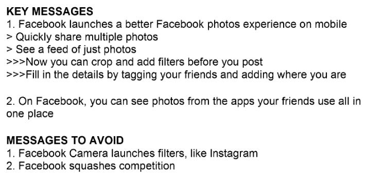 Camera ended up launching, for iPhones only, in May 2012, about six weeks after the Instagram buyout was announced. A set of talking points around the public messaging for the release of Camera sought to avoid comparisons to Instagram and the suggestion that “Facebook squashes competition”: