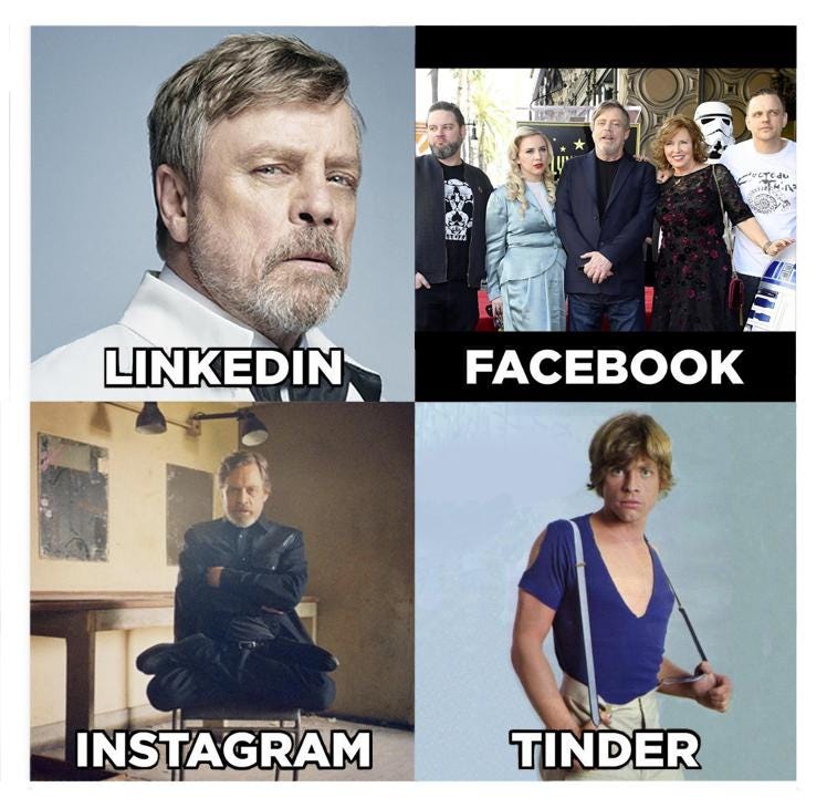 What makes the meme both relatable and relevant to the current trial is the recognition that we highlight different things about ourselves on different social media platforms. In the Facebook version of themselves, Kerry Washington and Mark Hamill are surrounded by family, part of what the FTC calls the PSN’s core use case of friends and family sharing. But in the LinkedIn versions, our subjects are suited up, as if for a job interview. The Instagram photos seem more produced or artsy. And the Tinder shots target, well, a much different use case.
